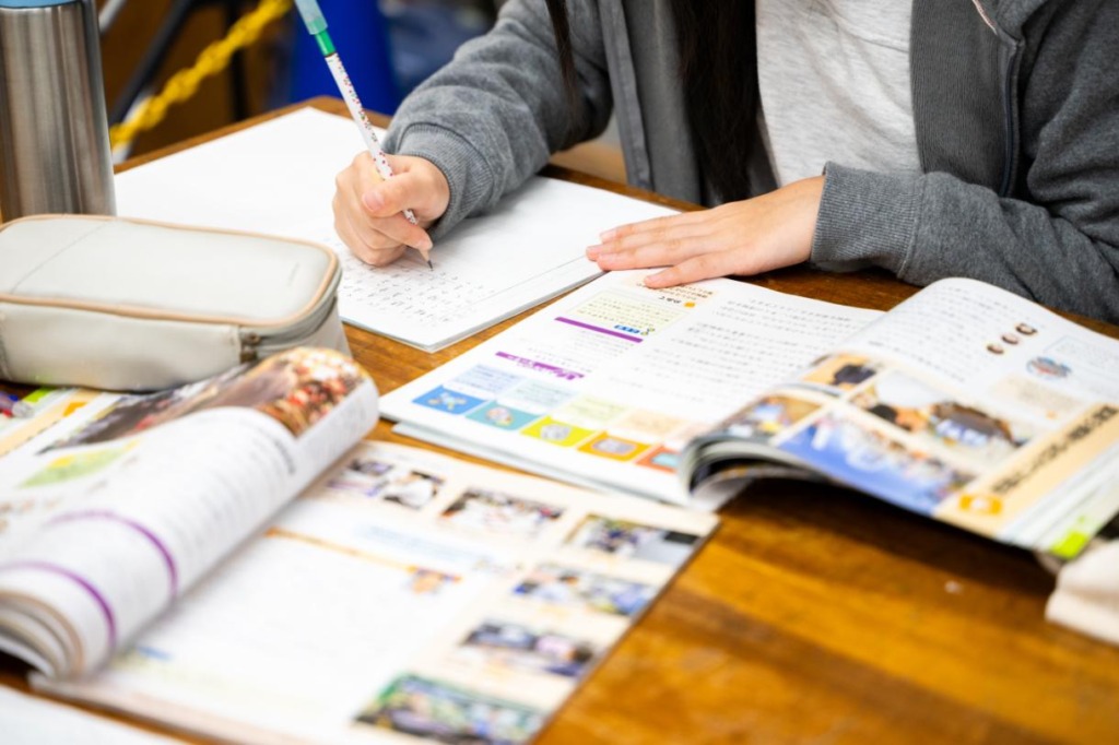 友だちと一緒に机を囲んで持ってきた宿題に取り組みます。