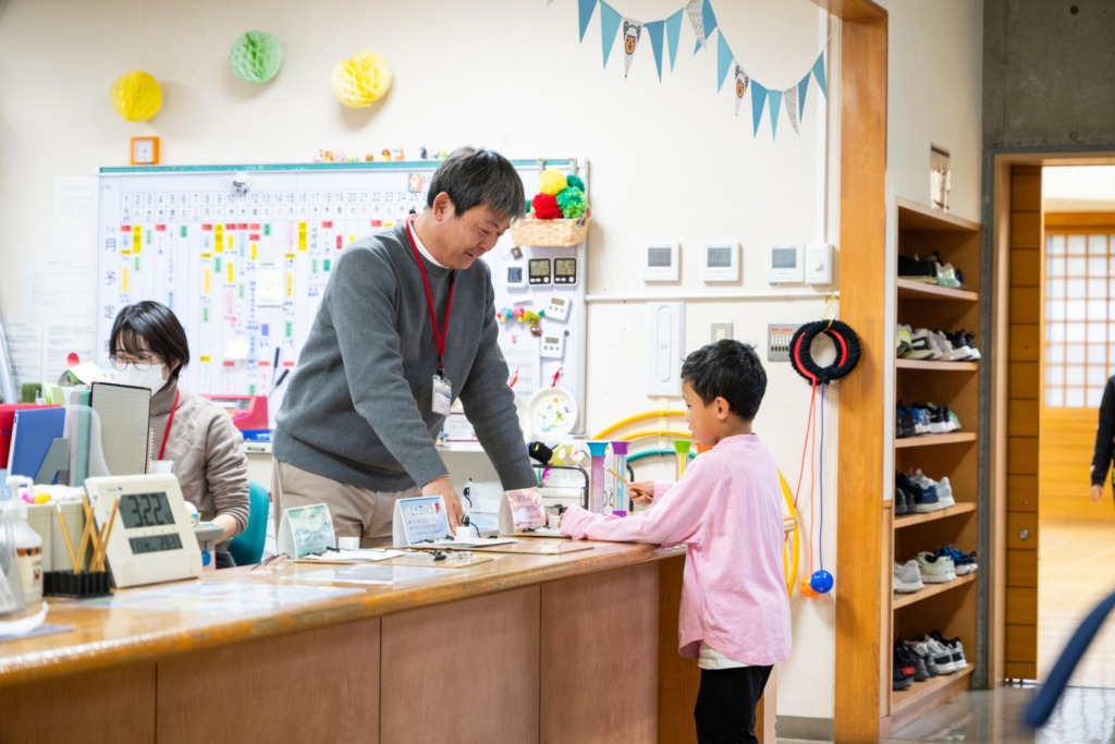 「こんにちは!」とあいさつをして、靴を靴箱に入れて、受付で名前を書きます。水筒などの荷物は所定の置き場へ。