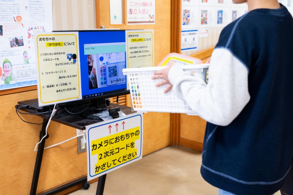 それぞれおもちゃやゲームのカゴには二次元コードが付いていて、「ピッ!」と画面に貸し出しを申請します。どのゲームが人気か一目で分かるこのシステム、児童館を利用していた高校生が開発したそうです。