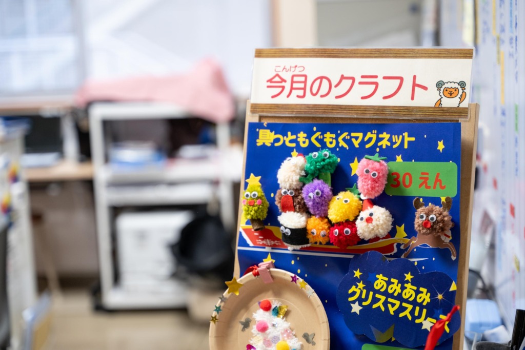 いろんな材料を利用した工作を月替わりで用意。材料費は10円〜100円程度で、季節行事にちなんだものや、プレゼントできるもの、遊べる作品づくりなどが楽しめます。