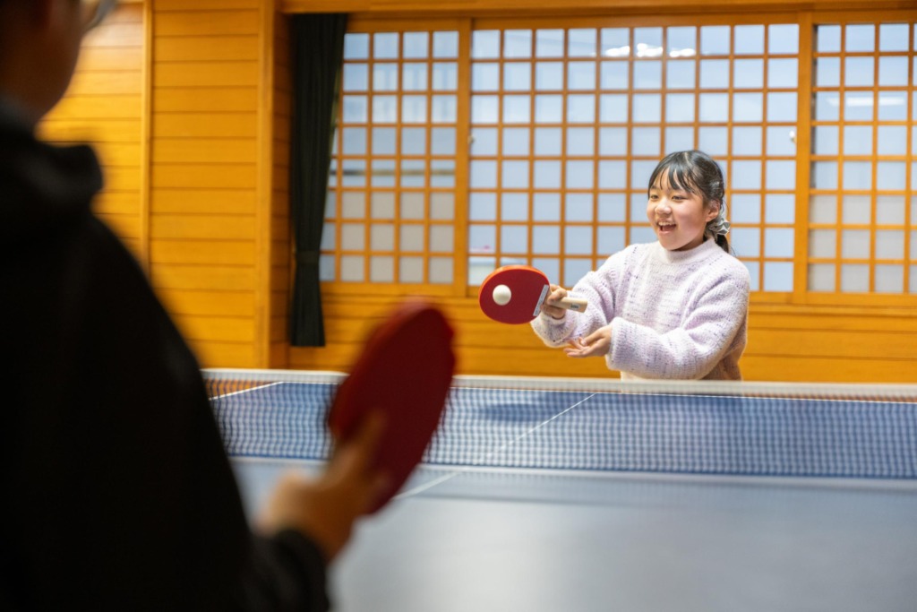 遊戯室で卓球、大縄とびで思いっきり体を動かしたり、